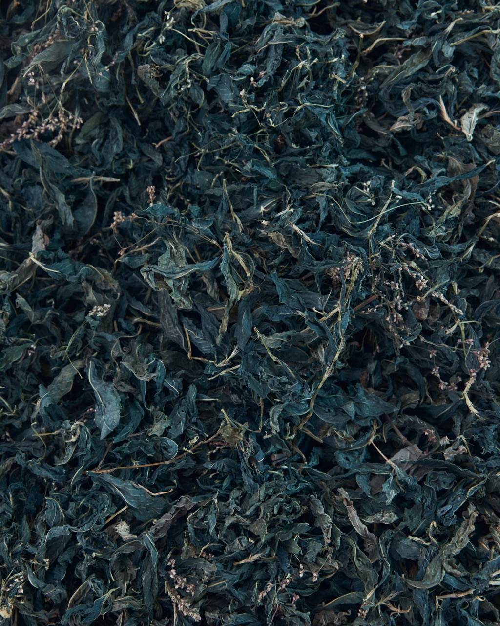 春に種をまき、 夏に藍葉をはぐくみ、 秋と冬には蒅をつくり、 一年余の時を経て色を迎える。